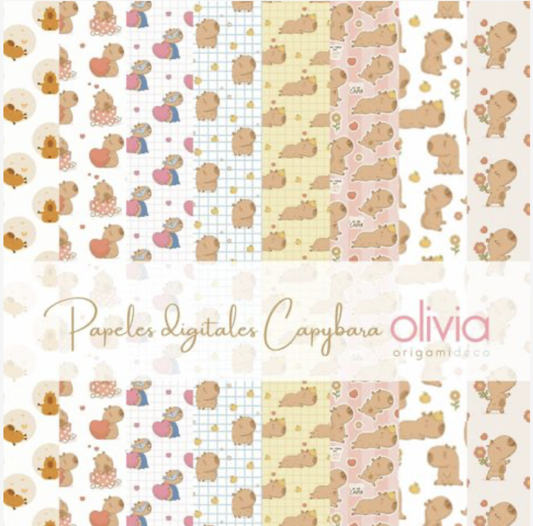 Set de 8 papeles digitales A4 de Capybaras y minilibro para pintar.